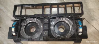 Componente para el control climático de un Mercedes W124. Presenta un diseño en plástico negro con detalles transparentes y diales para ajuste. - Dial con indicaciones de temperatura (18, 22). - Botones con símbolos (EC, recirculación, desempañado). - Marco superior con rejilla.