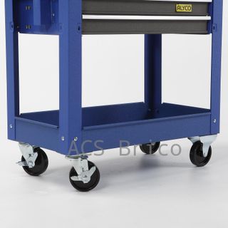Carro de taller de 3 bandejas en color azul. Ideal para organizar herramientas. - Estructura metálica resistente. - Ruedas para fácil movilidad. - Bandeja superior con cajón extraíble.