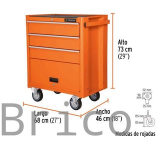 CARRO SIN HERRAMIENTAS 4 CAJONES - TRUPER Carro sin herramientas de la marca Truper ideal para talleres mecánicos e industriales, para herramientas. Permite transportar, organizar y almacenar la herramienta. ESPECIFICACIONES TECNICAS: - Capacidad de carga: 90 Kg - Dimensiones: 880x680x460 mm (Alto x largo x ancho) - Ruedas macizas - Fabricado en acero - 4 Ruedas (2 fijas y 2 giratorias con freno) - 4 bandejas
