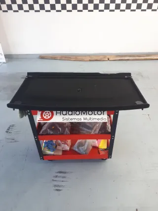 Carro de herramientas de taller con tres niveles. Su diseño es robusto y funcional para organizar tus herramientas. - Color rojo. - Tres bandejas. - Ruedas para fácil movilidad.