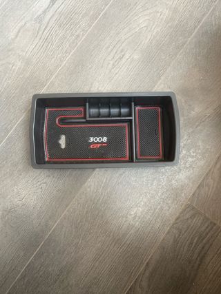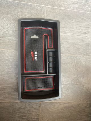 Bandeja organizadora para el compartimento central del Peugeot 3008 GT. - Diseño a medida para el modelo. - Incluye alfombrillas antideslizantes con borde rojo. - Compartimentos para monedas y otros objetos pequeños.