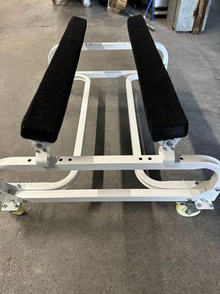 NUEVO !! Se vende soporte para transportar embarcaciones neumáticas o auxiliares. Es una estructura robusta y fácil de usar, ideal para guardar o mover tu barco de forma segura. - Fabricado con materiales resistentes y duraderos. - Incluye dos almohadillas acolchadas para proteger la embarcación. - Dispone de ruedas para facilitar su desplazamiento. - Estructura de metal con acabado en blanco. se manda a vualquier pun