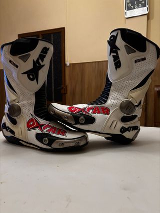 Botas de moto Oxtar, ideales para carretera o circuito. Diseñadas para ofrecer protección y comodidad. 🏍️Las botas tienen muy poco uso y han sido utilizadas dos veces. Son talla 45. Son la edición limitada de Álvaro Bautista cuando su mundial de 125 cc. Precio algo negociable🤗