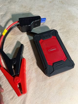 Arrancador de batería portátil de la marca CYABER. - Color rojo y negro. - Pinzas de conexión incluidas.