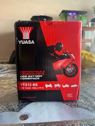 Batería de moto Yuasa YTX12-BS. - Modelo: YTX12-BS - Tecnología: AGM - Capacidad: 10.5Ah (20HR) - Corriente de arranque en frío (CCA): 180A - Voltaje: 12V - Fabricada en Indonesia