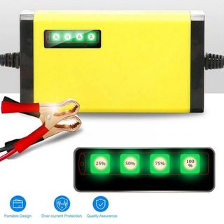 Cargador de batería para vehículos. - Diseño compacto y amarillo. - Incluye pinzas de conexión (roja y negra). - Adaptadores de enchufe para diferentes tomas de corriente.