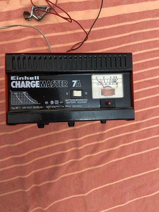Cargador de batería Einhell Chargemaster 7A. - Modelo: Typ BF 7. - Voltaje de entrada: 220V 50/60 Hz. - Voltaje de salida: 6/12 Volt. - Corriente de carga: 7A. - Fabricado en Alemania Occidental.