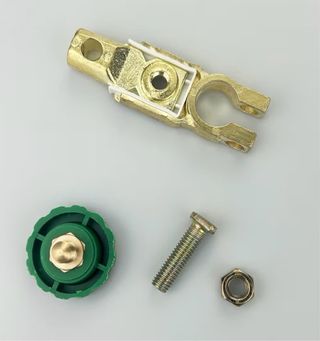 Interruptor de desconexión para baterías de 12V y 24V. Permite cortar la corriente de forma rápida y segura. - Fabricado en latón. - Incluye mando giratorio verde. - Dimensiones: 86mm (largo) x 36mm (alto). - Diámetro del borne: 16-18mm. - Diámetro del mando: 35.5mm. - Altura del terminal: 16.3mm.