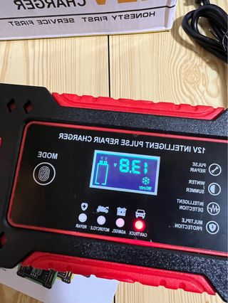Cargador inteligente para baterías de coche de 12V con tecnología de pulso. - Pantalla digital para visualización de datos. - Modos de carga: Reparación, Invierno y Verano. - Detección inteligente y protección múltiple. - Indicadores para coche/camión, AGM/Gel y motocicleta. - Botón de modo para selección de funciones.