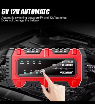 Cargador de baterías para coche, compatible con voltajes de 6V y 12V. - Indicadores LED de carga: POWER, 50%, 75%, 100%. - Modos de carga: 6V, 12V, REPAIR. - Marca: FOXSUR. - Corriente de carga: 1.5A.