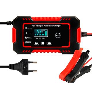 (NUEVO A ESTRENAR) Cargador de batería y mantenimiento automático inteligente de 6A 12V para coche, moto, etc. Adecuado para baterías de plomo-ácido de 12V 4AH-100AH (AGM, GEL, MF, SLA, VRLA) Pantalla digital inteligente: puede mostrar la corriente / voltaje / potencia. Protección contra sobretensión, sobrecalentamiento, contra baja tensión Detección de voltaje y alimentación: puede verificar el voltaje restante de la batería conectando la batería sin conectar la fuente de alimentación. Apagado automático después de la carga completa, botón de reparación. (El color puede ser rojo ó amarillo, depende las existencias)