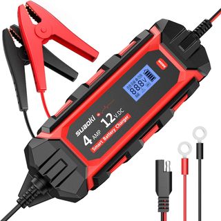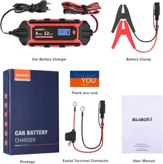 Cargador inteligente de batería SUAOKI de 4 amperios y 12 voltios. - Diseño robusto en rojo y negro. - Pantalla digital para información de carga. - Incluye pinzas de conexión y adaptadores. - Indicador de modo y estado de la batería.