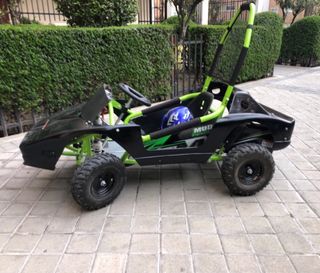 Buggy eléctrico tipo kart, ideal para diversión. - Estructura tubular de color verde. - Asientos ajustable. - Ruedas todoterreno. - Motor 1000w a 48v. Se le adapto una carroceria de coche fantástico, se le hizo instalación de luces de oposición, freno, e intermitentes, la carroceria ahora mismo hay que pintarla y se estropearon las baterias, originalmente lleva 4 baterias de 12v un total de 48v, yo ahora usaba una de litio de 52v e iba increíble ademas de reducir el peso y alargar duración, tiene dos velocidades y marcha atrás, tiene suspensión y aguanta un peso de 110kg, para mas información preguntar.