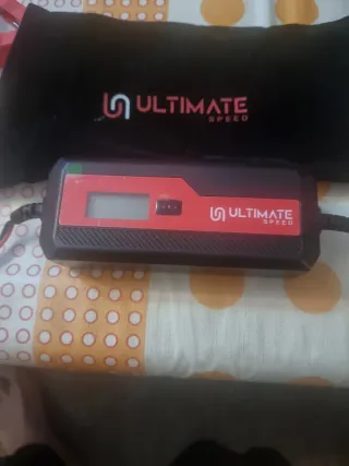 Cargador de baterías de la marca Ultimate Speed. Incluye bolsa de transporte. - Diseño en color negro y rojo. - Pantalla digital. - Logo de la marca visible.