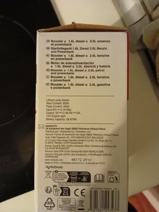 Arrancador de batería Norauto para emergencias. - Diseño compacto y robusto. - Indicador digital de estado. - Botón de encendido/apagado. - Indicadores visuales de preparación y arranque. El producto se ha usado 2 veces y funciona correctamente,cuenta con la bolsa para llevarla en tu coche y con las instrucciones para su funcionamiento. Precio Negociable. Producto Nuevo valorado en 150€ en página oficial de Norauto