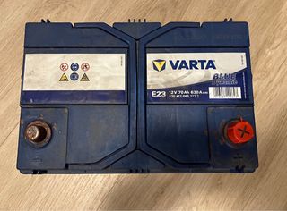 Batería Varta E23 con especificaciones de 12V, 70Ah y 630A. Descargada. Para recuperar. Fabricada en Marzo de 2020 - Modelo: E23 - Voltaje: 12V - Capacidad: 70Ah - Corriente de arranque en frío (EN): 630A - Serie: Blue Dynamic - Marca: Varta - Fabricante: Clarios