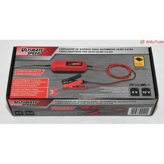 Cargador de baterías para coche y moto de la marca Ultimate Speed. 6v y 12v - Color rojo y gris. - Pantalla digital con información de carga. - Pinzas de conexión incluidas.