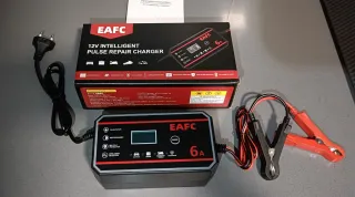 Cargador inteligente EAFC de 12V y 6A, diseñado para baterías de coche y moto. Cuenta con pantalla digital y múltiples protecciones. - Voltaje de entrada: AC 110-230V (50-60Hz). - Voltaje de salida: DC 13.8-15.5V. - Corriente de salida: 6A (Max). - Para baterías de plomo-ácido de 4Ah-100Ah. - Funciones: Detección inteligente, protección múltiple, modo invierno/verano, reparación de pulsos.