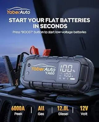 Arrancador de baterías portátil Yaber YA60 con pantalla digital. - Capacidad de 6000A. - Diseño robusto en color negro. - Incluye pinzas de arranque rojas y negras. - Indicador de porcentaje de batería. - Puertos USB y Type-C. dispositivo de la imagen es un arrancador de batería portátil YaberAuto YA60. Sus características clave incluyen: Potencia: Pico de corriente de 6000A, adecuado para arrancar todo tipo de motores de gasolina y diésel de hasta 12.0L. Batería: Capacidad de 26800mAh, que también funciona como power bank. Carga Rápida: Puerto USB-C de 45W con carga rápida bidireccional y salidas USB-A adicionales.