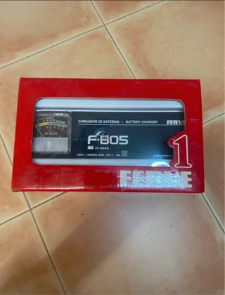 Cargador de baterías FERVE modelo F-805. - Capacidad de 32-60Ah. - Voltaje de entrada 230V, 50/60Hz. - Potencia 83W. - Voltaje de salida 12V, 5A. - Fabricado en España.