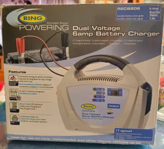 Cargador de baterías portátil de la marca Ring, modelo RECB206. ES UN CARGADOR DE BATERÍAS, NO UN ARRANCADOR!!!!! - Voltaje dual para baterías de 6V y 12V. - Capacidad de carga de 6 Amperios. - Indicador de polaridad inversa. - Diseño ergonómico con asa para fácil transporte. - No es portatil, para funcionar tiene que estar conectado a la corriente!!!!