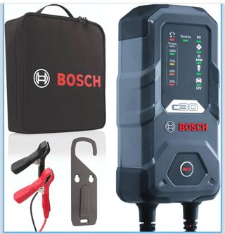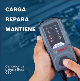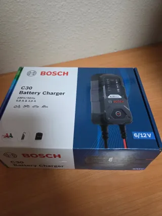 Cargador de baterías Bosch C30 para coches y motos. Ideal para mantener la carga de baterías de 6V y 12V. - Modelo: C30 - Voltaje: 230V / 50Hz - Corriente de carga: 0,8 A & 3,8 A - Apto para baterías de 6V y 12V.