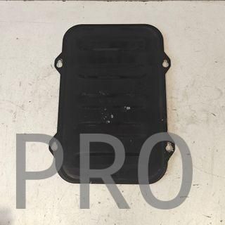 Tapa de batería para camión Volvo. Pieza de plástico negro con una cubierta metálica perforada. - Cubierta metálica con múltiples orificios. - Base de plástico negro. - Marca: Renault Trucks.