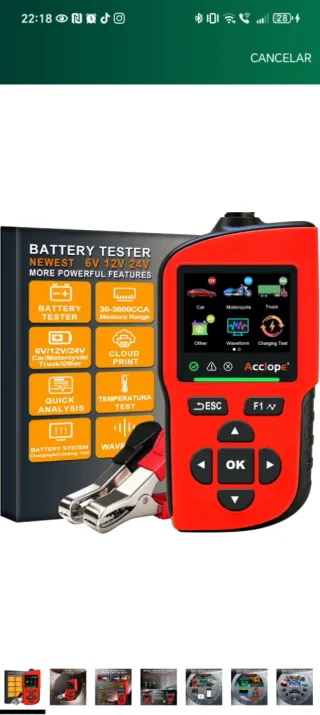 Comprobador de baterías Acclope BT60 Pro. - Para baterías de 6V a 24V. - Rango de medida de 100-3000CCA. - Precisión superior al 99.8%. - Realiza test de resistencia. - Test de batería y sistema de carga. - Incluye test de arranque.