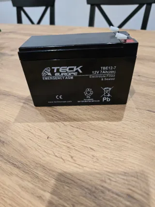 Batería de 12V 7Ah de la marca Teck Europe, modelo TBE12-7. - Tipo: Emergency AGM. - Electrolito relleno y sellado. - Indicador de reciclaje de plomo (Pb). - Certificación CE. Especificaciones Técnicas Voltaje: 12V. Capacidad: 7 Ah. Dimensiones: 151 x 65 x 94 mm. Terminal: Faston F2 (6.3 mm). Vida útil: Estimada entre 3 y 5 años bajo condiciones normales de uso.