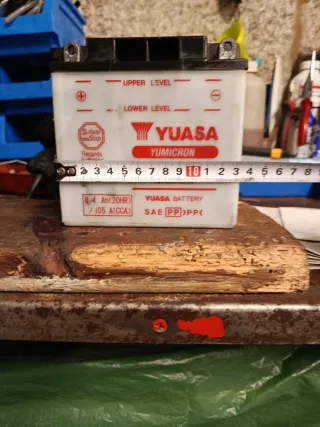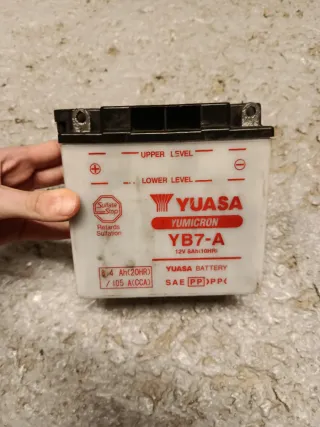 Batería de moto Yuasa YB7-A. En buen estado, cargada y agua destilada rellenada. - Modelo: YB7-A - Voltaje: 12V - Capacidad: 8Ah (10HR) - Corriente de arranque en frío (CCA): 105A