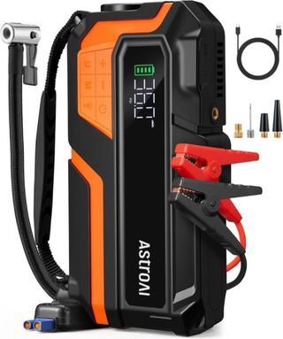 Arrancador de coche y compresor de aire portatil. - Capacidad de arranque de 6000A. - Presión máxima de inflado de 150 PSI. - Incluye pinzas de batería, cable USB y adaptadores de boquilla. - Robusto y potente. - Linterna LED. - Función powerbank. - Estuche. - Artículo nuevo a estrenar.