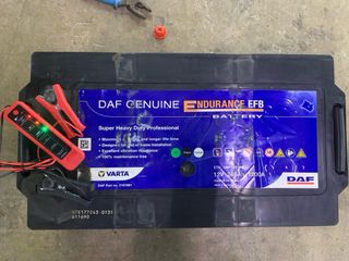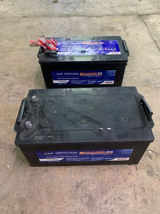 Dos baterías DAF GENUINE ENDURANCE EFB para uso profesional. - Capacidad de 240Ah y 1200A de arranque. - Tecnología EFB para mayor durabilidad. - Diseñadas para instalación en el chasis. - 100% libres de mantenimiento. Tienen menos de un año, las cambiaron por equivocacion .