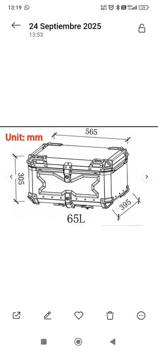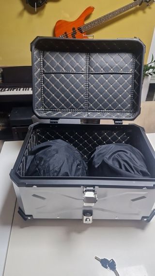 -Baúl de aluminio NUEVO A ESTRENAR para moto. -Puedes elegir en color plateado con tapa negra, o negro entero. -65L de capacidad. -Caben 2 cascos integrales CON INTERCOMUNICADOR EXTERIOR + 2 pares de guantes y todavia entra alguna cosa mas. -Trae dos llaves + forro interior con 2 bolsillos + la base de sujección universal para colocar sobre el soporte de tu moto -Te lo envío en un máximo de 24h