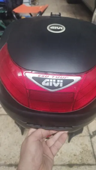 Baúl de moto Givi en color negro y rojo, con capacidad para dos cascos. - Diseño aerodinámico. - Incluye luz trasera. - Cierre seguro. Lo llevaba en yamaha majesty 400 esta con todos sus soportes y todo lo tengo dentro del baul