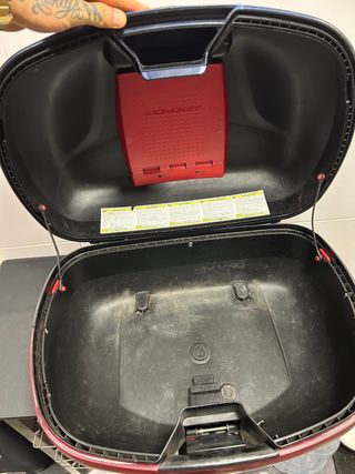 Cofre o baúl para moto en color negro con detalles en rojo. Ideal para transportar objetos de forma segura. Falta llave de cierre - Diseño aerodinámico. - Cierre con llave. - Acabado brillante.