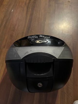 Baúl para moto de la marca Kimco. Tiene algunos pequeños rasguños en la superficie, pero está en buen estado general. - Marca: Kimco - Color: Negro con detalles grises - Capacidad: Amplia (entra 1 casco)