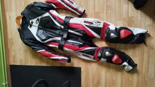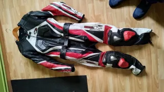 Traje de moto de dos piezas fabricado en piel de canguro. Diseño deportivo y protector. - Chaqueta y pantalón unidos por cremallera. - Protecciones integradas en hombros, codos, espalda, rodillas y caderas. - Paneles elásticos para mayor movilidad. - Cierre de cremallera frontal y en puños. - Detalles en color rojo y blanco. -Sin caídas y siempre cuidado talla 54 yo mido 1'80 y peso 70 pero cuando lo compre tenía 10 kg por sí vale de referencia. - Lo vendo porque ya no tengo moto
