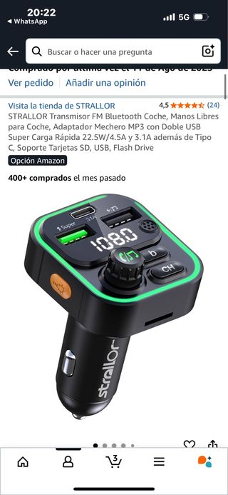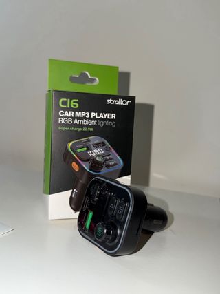 Transmisor FM Bluetooth para coche de la marca STRALLOR. Permite manos libres y reproducción de MP3. - Doble puerto USB para carga rápida (22.5W/4.5A y 3.1A). - Puerto USB-C. - Soporta tarjetas SD, USB y Flash Drive. - Pantalla digital para frecuencia y carga. Nunca se ha llegado a usar por lo que esta totalmente nuevo, me costó 12€ en amazon.