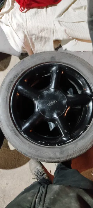 Juego de 4 llantas de aleación para Ford. - Diseño deportivo de 5 radios. - Acabado en negro brillante. - Incluye tapa central con logo Ford. - Medida del neumático: 205/50R15.