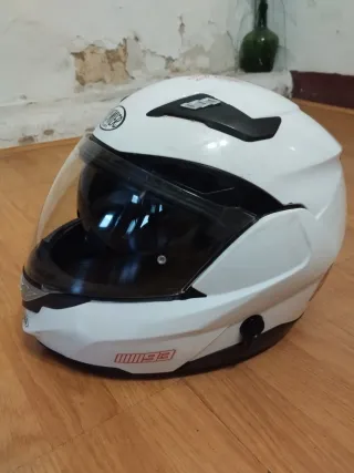 Casco integral Shiro Track GP en talla L. Diseño deportivo con detalles en blanco y rojo y carbono - Cierre de doble anilla. - Interior extraíble y lavable. - Visera clara. - Incluye pegatinas Gives You Wings y Pull&Bear de Marc Marquez