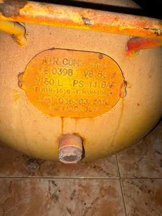 Compresor de aire de color amarillo, con un diseño robusto y práctico. - Depósito de gran capacidad. - Ruedas para facilitar el transporte. - Incluye manómetro. El compresor es de 50l y 11 bar. Funciona perfecto. Lo vendo por tener otro mas grande i no darle uso a este.