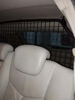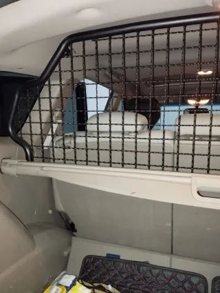 Robusto separador para mascotas, está montado en un SsangYong kiron, se sujeta en el unas chapas que van donde el cubre maletero y unos agujeros preparados para accesorios.