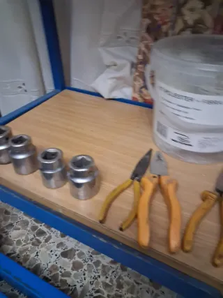 Estantería metálica para taller mecánico, ideal para organizar herramientas. Incluye varios accesorios. - Estantería de metal resistente. - Juego de llaves de vaso. - Alicates de diferentes tipos.