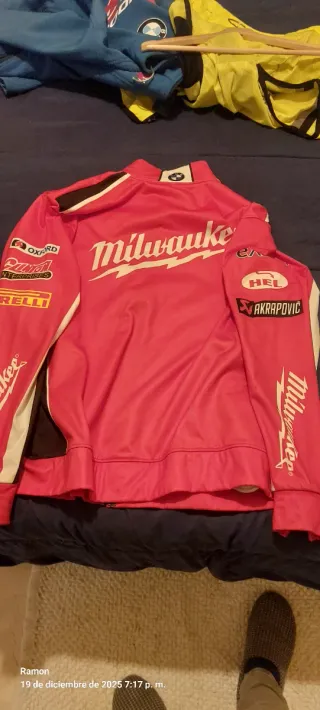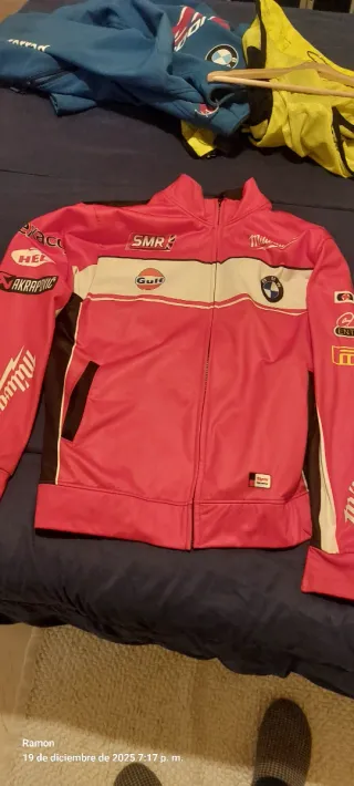 Sudadera estilo racing con varios logos de marcas.una talla L y otra talla M - Diseño en color rojo blanco y negro. - Logo SMR. - Logo Gulf. - Logo BMW. - Logo Akrapovič. - Logo Milwaukee. - Logo Pirelli.