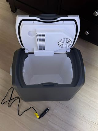 Nevera portátil de la marca Halford, ideal para viajes en coche. - Color gris oscuro y blanco. - Incluye cable de conexión para el mechero del coche.