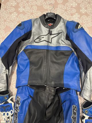 Conjunto de dos piezas de piel de la marca Alpinestars. Mido 1,75 y peso 80 kg y me esta bien . - Color azul y negro. - Diseño deportivo. Con guantes 50€ mas