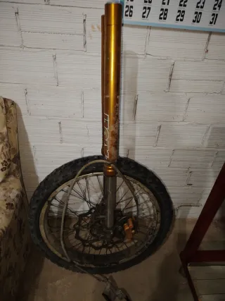 Conjunto de horquillas invertidas para moto Beta rrt, ahy que hacerle el mantenimiento de retenes.Algo negociable - Color dorado. - Incluye freno de disco, pinza y llanta todo entero