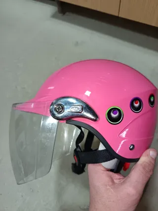 Casco de moto de color rosa, ideal para niñas. Cuenta con una visera transparente y detalles decorativos. - Color: Rosa - Visera transparente - Cierre de seguridad - Diseño con círculos de colores