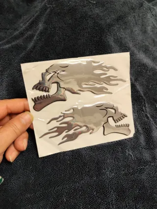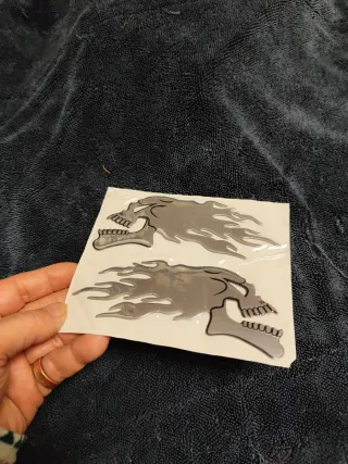 Set de dos pegatinas decorativas con diseño de calavera y llamas. Cromadas - Acabado plateado brillante. - Diseño de calavera con llamas. - Ideales para personalizar superficies. Coches motos etc