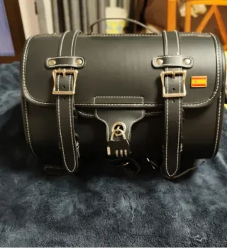 Medida de largo 31cm Alto 20cm Ancho 17cm Maleta trasera para moto, con un diseño clásico y elegante. Se puede llevar también de la ansa que lleva o ponerla detrás de la moto bici etc - Fabricada en cuero sintético negro. - Costuras blancas decorativas. - Cierres con hebillas y pasador. - Incluye un pequeño pin de la bandera de España. Y candado